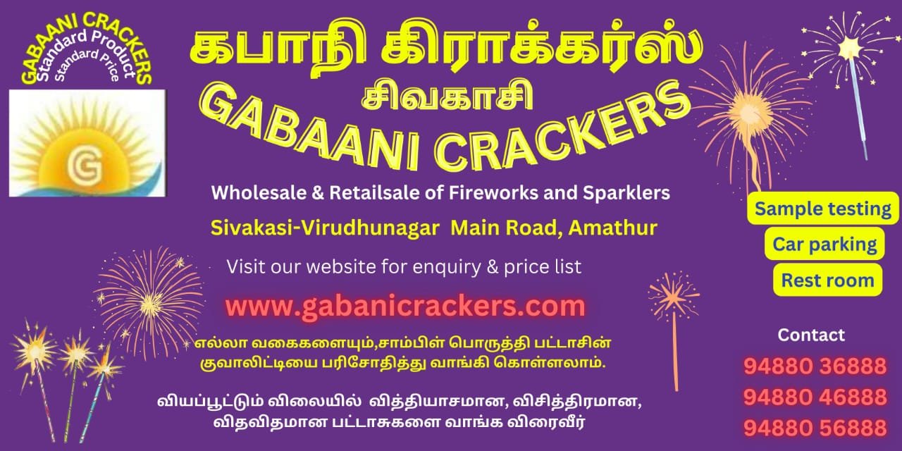 GABAANI CRACKERS is one of the leading wholesale and retail fire cracker stores in Sivakasi. One-stop shop for all your cracker needs for wholesale and retails, A strong base in supplying, crackers, fancy / pyrotech items, and gift boxes for whole Tamilnadu and other states throughout the year for all festivals, functions, and celebrations. Celebrate each and every happy occasion with our products